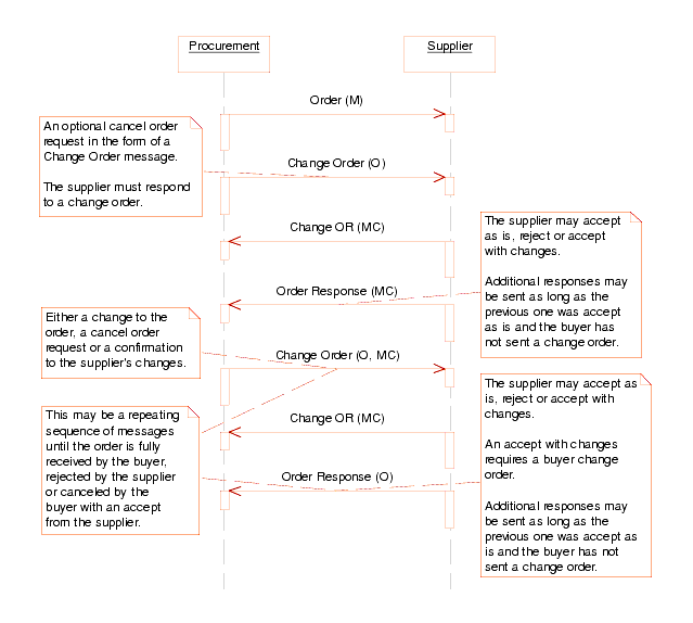 The buyer may initiate a change order only after a positive response is received from the supplier. In addition, the buyer submitting a change request is optional. However, if the supplier's latest order response was a change to the order then the buyer is required to send a change order. This conditionally mandatory change order on the part of the buyer is necessary in order to accept, reject or modify the supplier's changes. Furthermore, the supplier may not issue another order response until the buyer responds to the supplier's changes.