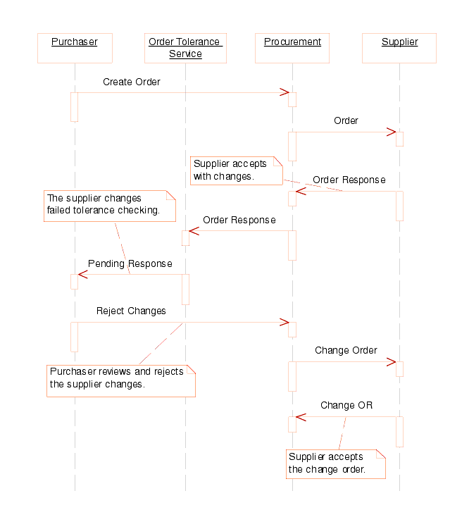 Shortly after Procurement receives the response to the change order, the Order Tolerance service processes the response. The service checks the supplier changes against the tolerance rules setup for the supplier at the buying organization's supplier option level. In this case, the changes were not within the tolerance levels of the system.