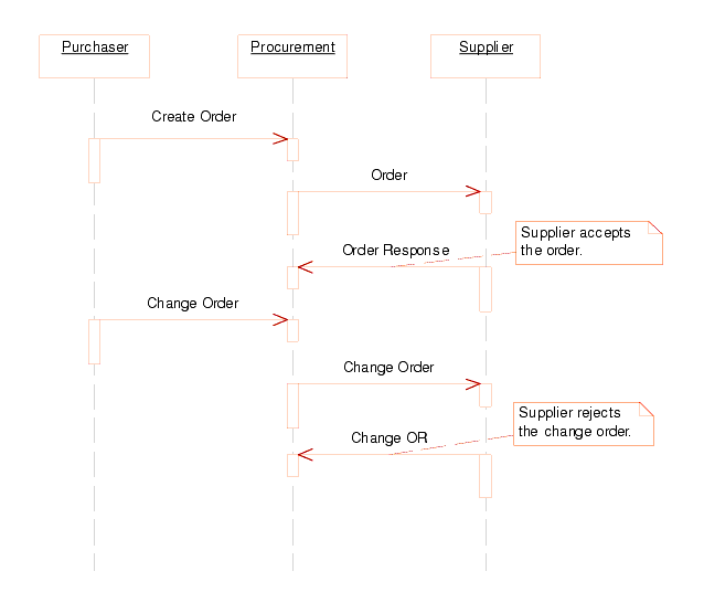Description: The supplier accepts an order sent by the buyer and sends back an order response. Then the buyer changes the order and Procurement sends the change order to the supplier. The supplier rejects the change order and sends back a change order response to the buyer